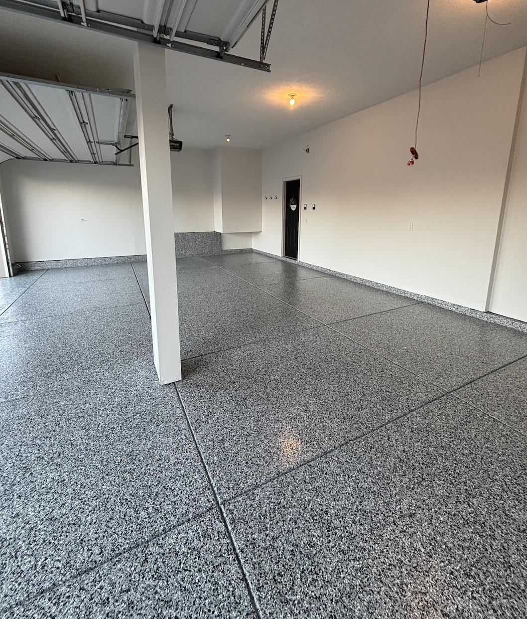 Our epoxy flooring combines strength, style, and durability. We apply a high-performance epoxy base coat to create a smooth, seamless surface, then add decorative vinyl flakes for color, texture, and slip resistance. A clear polyaspartic top coat seals the system, providing a glossy, easy-to-clean finish that resists wear, chemicals, and UV damage — built to last and look great for years. Primary choice for garages and shops.